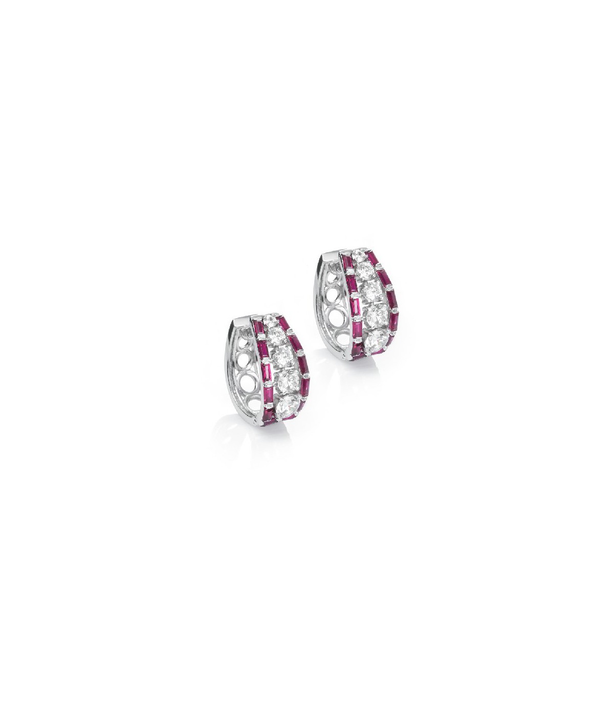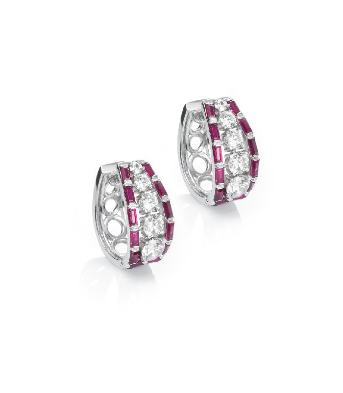 Spectacular and elegant pair of silver earrings where synthetic diamonds of the Signity brand shine. High quality white and red stones that meet the ideal standards for maximum reflection. Bright cut and baguet. Its physical and visual properties are almost the same as those of a natural stone.
