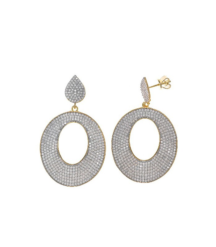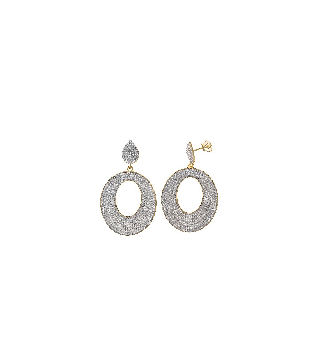 Earrings in Sterling Silver 925 mls, 18k yellow gold plated, covered with micro pave of white zircons. The teardrop-shaped upper part, with the butterfly pressure toothpick closure, perfectly covers the lobe. Length 5 cm.
