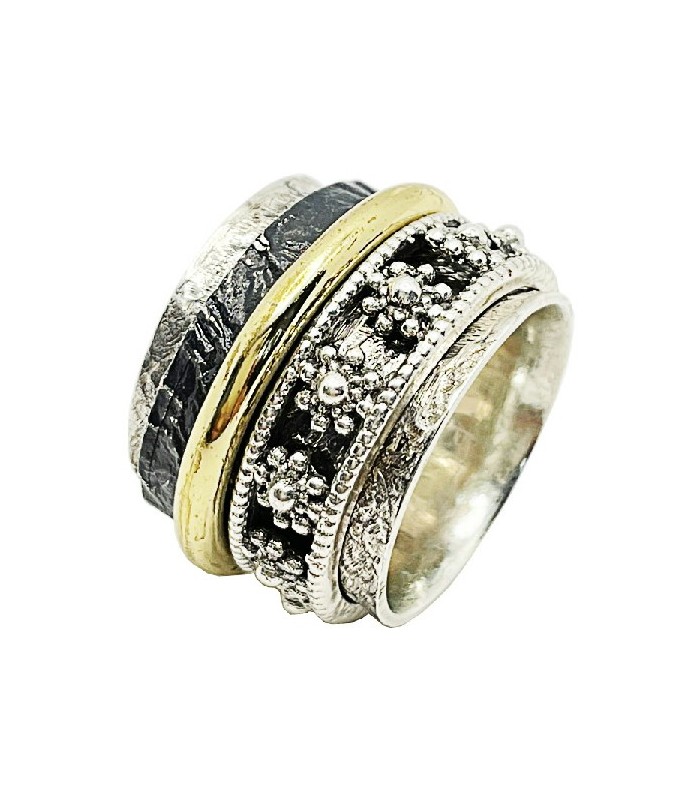 Anillo antiéstres en Plata de Ley 925 mls con 3 aros giratorios, 1 de retunio negro, en Bronce y otro imitando a bordado. Un delicado trabajo artesanal que hace esta pieza única. Disponible en todas las medidas con plazo de entrega entre 15 a 20 días. Talla: 12 (otras medidas bajo pedido)
