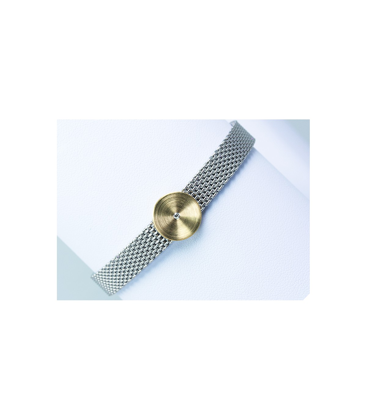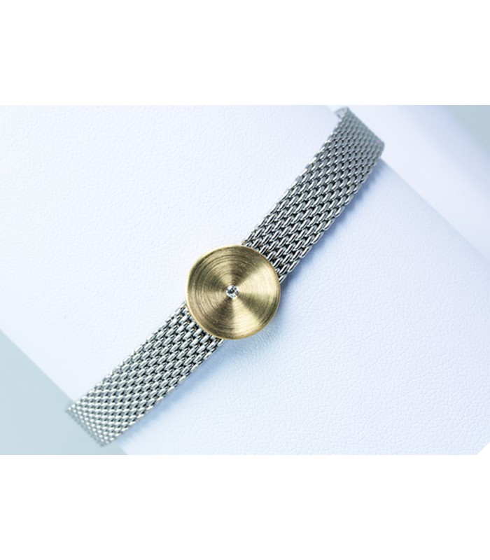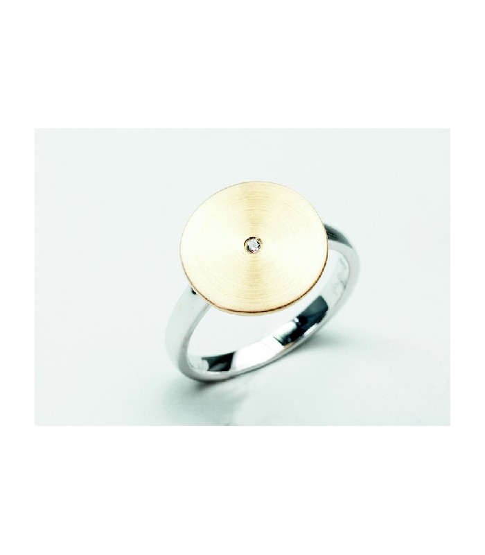 Anillo sencillo en Plata de Ley 925 mls con un disco de 1 cm chapado oro amarillo, y una circonita en el centro. Diseño informal, moderno y discreto. Forma parte de un set de tres piezas con el collar, los pendientes y la pulsera que encontras en nuestra web. tALLA: 18