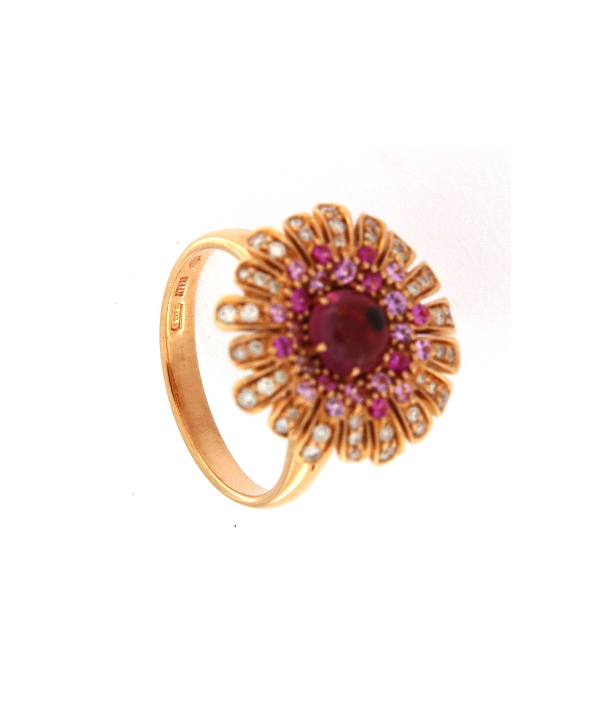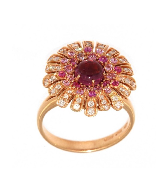 Pendientes de ROBERTO COIN de la colección Margherita en Oro rosa 18k (7,68gr), con 0,64 quilates de Diamantes blancos. Turmalina cabochon (2 quilates) en su centro, zafiros rosa (0,92 quilates) en los petalos. El...
