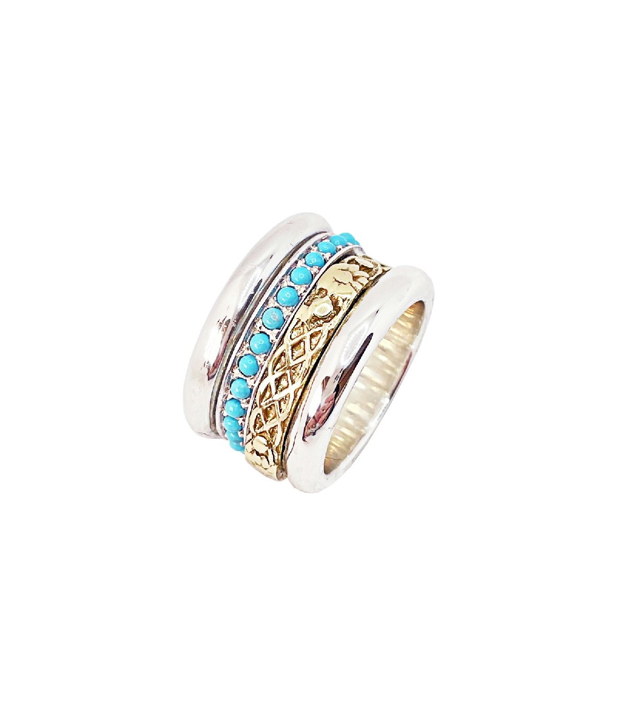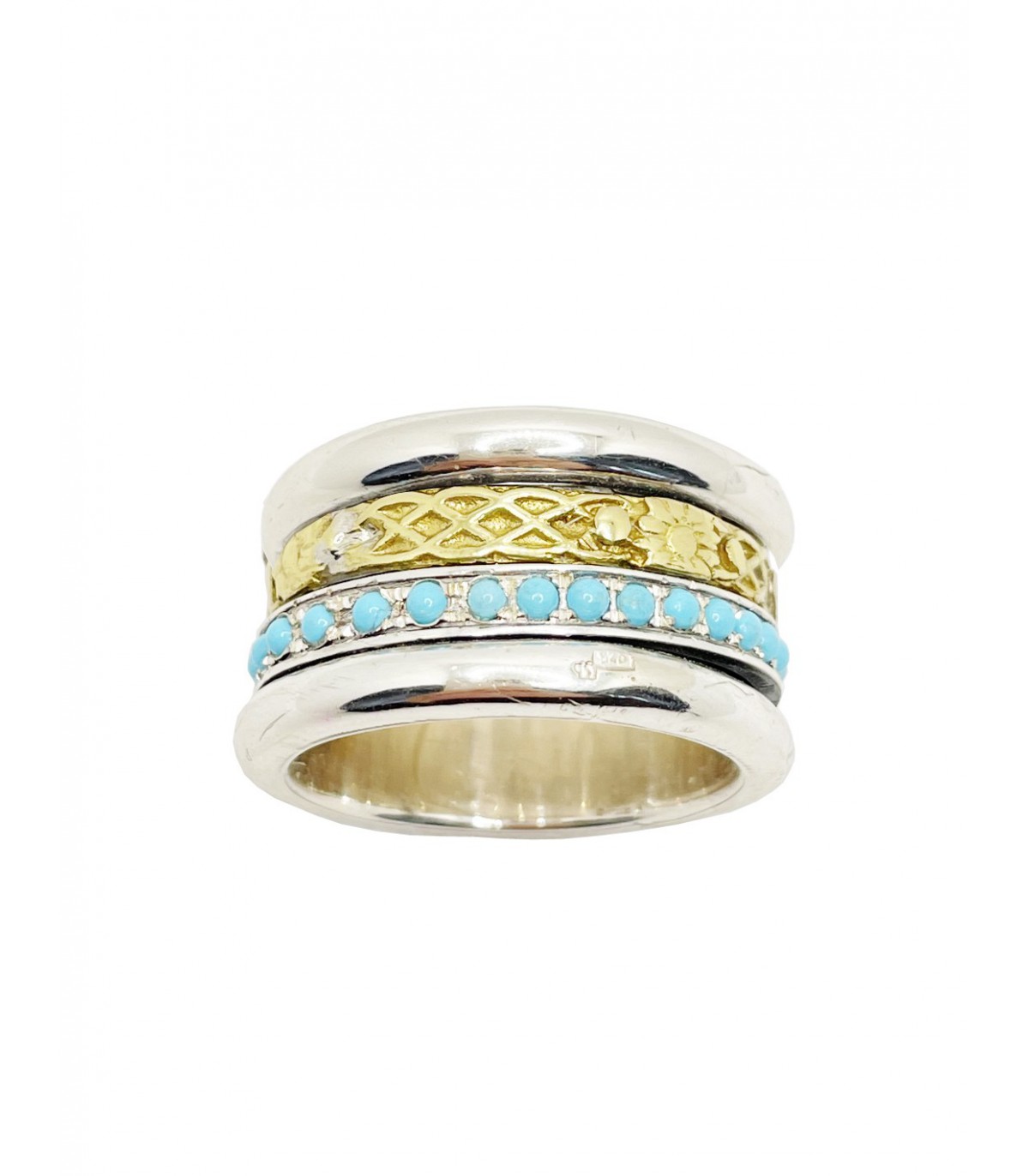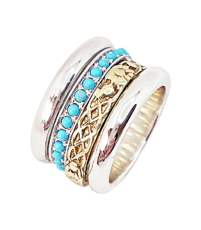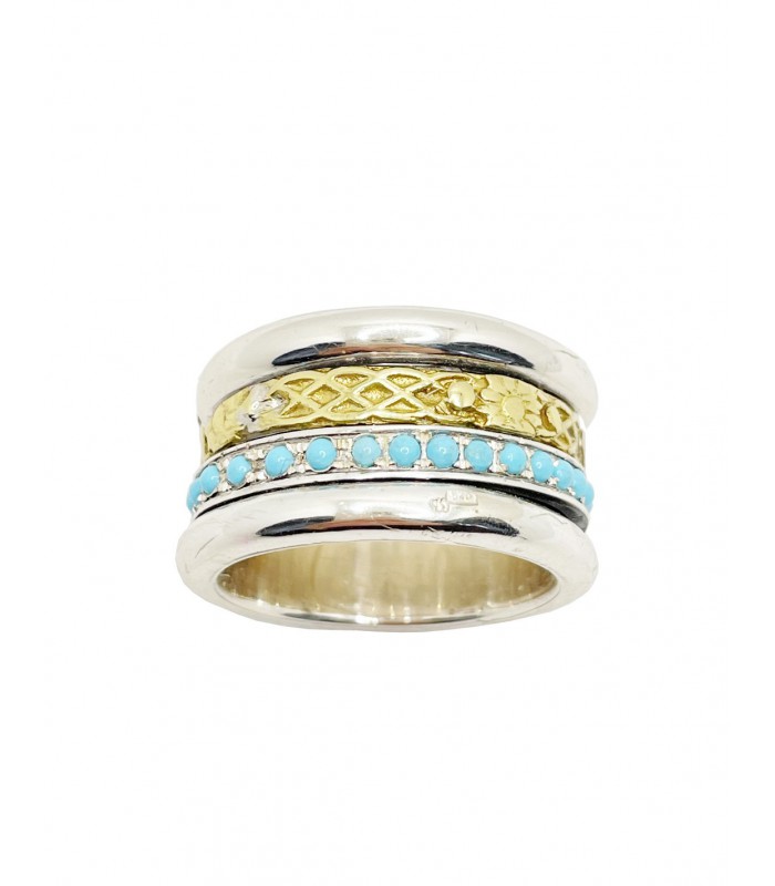 Sortija antiéstres de 15mm de ancho en Plata de Ley 925 mls con Turquesas y Bronce labrado, formada por dos aros que giran 360 grados. Una exclusiva pieza que aporta color y originalidad.