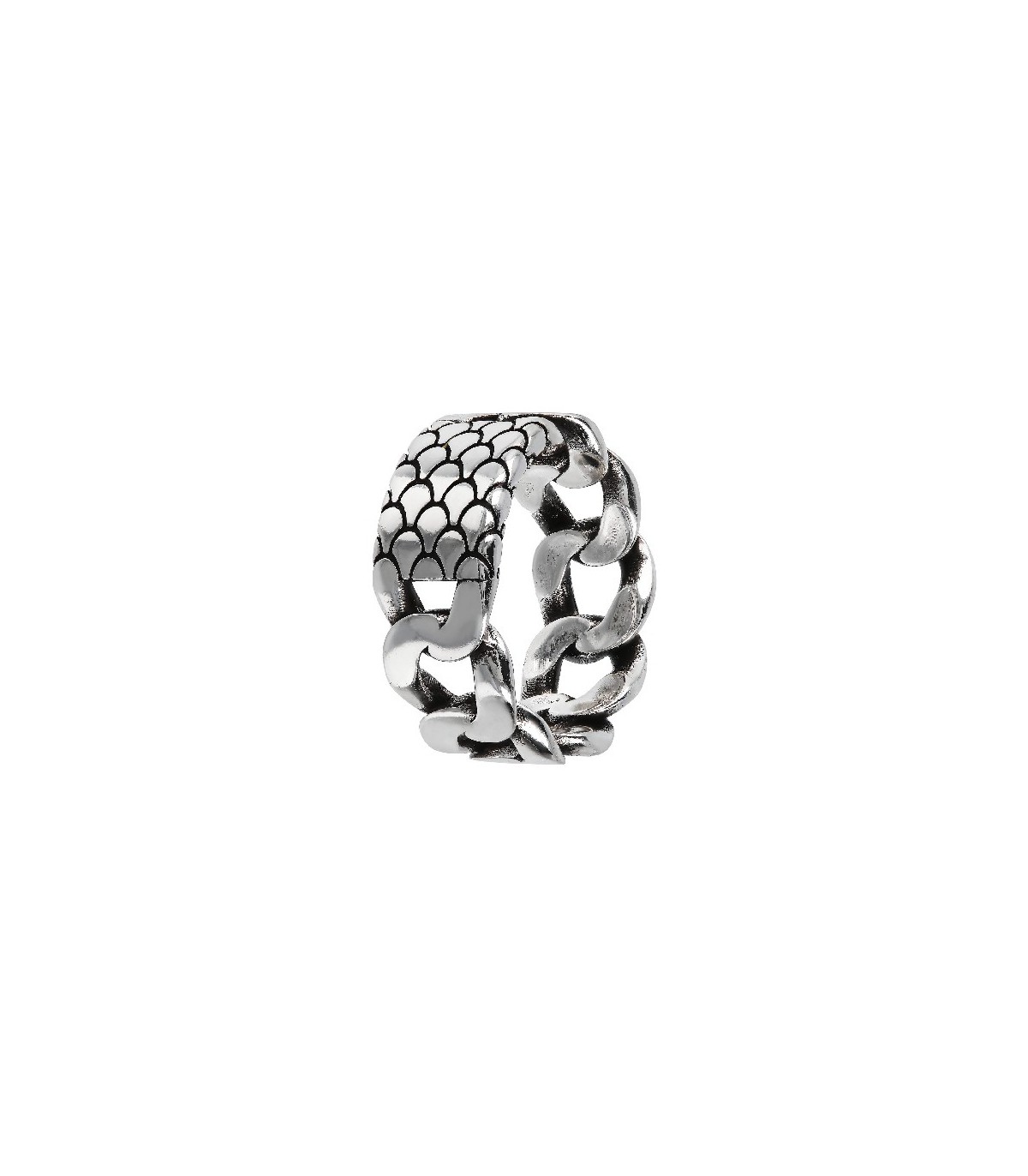 Anillo en Plata de Ley 925 mls, formado por eslabones y una placa central con la técnica decorativa llamada textura de tinta. Ancho 10mm.
