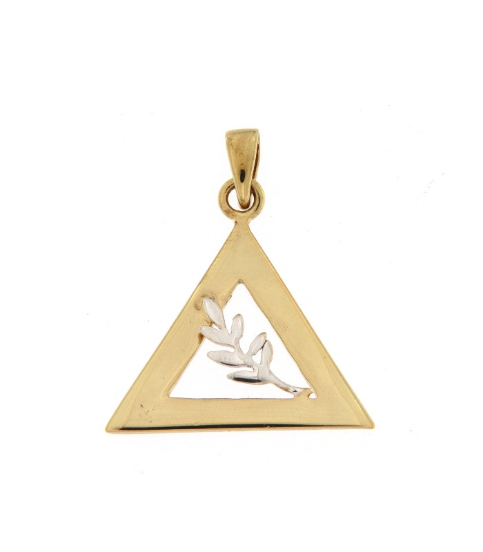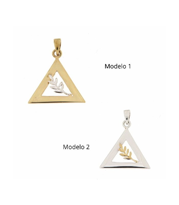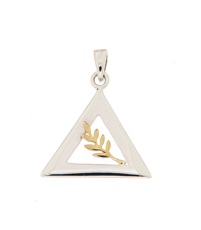 - ¿Te encantan las joyas simbólicas? Hazte con este colgante en plata de Ley 925 mls. Un diseño compuesto por el triangulo equilátero bicolor, chapado oro amarillo o rodiado, con una rama de acacia en su centro. Una pieza de lo más versátil que puedes llevar tanto en tu día a día como para ocasiones especiales.