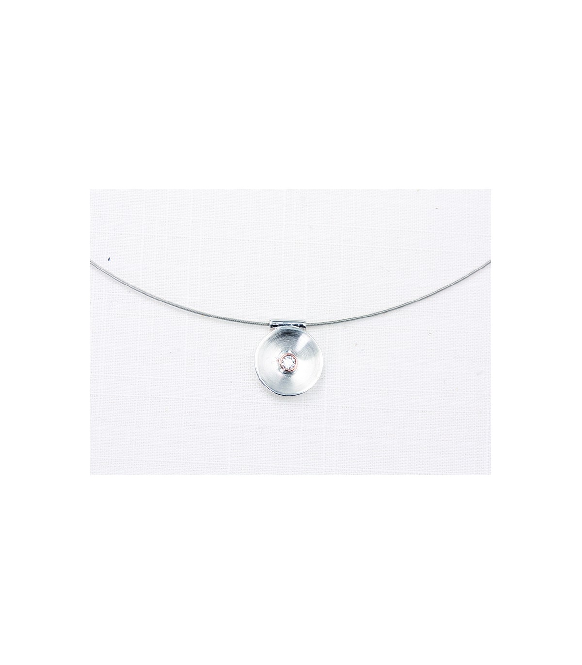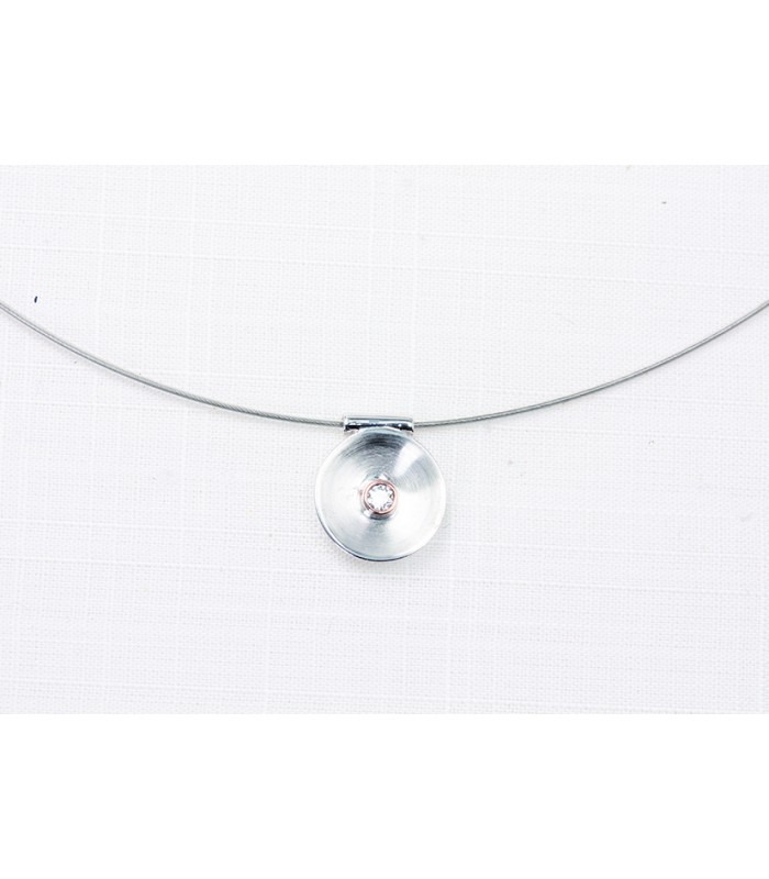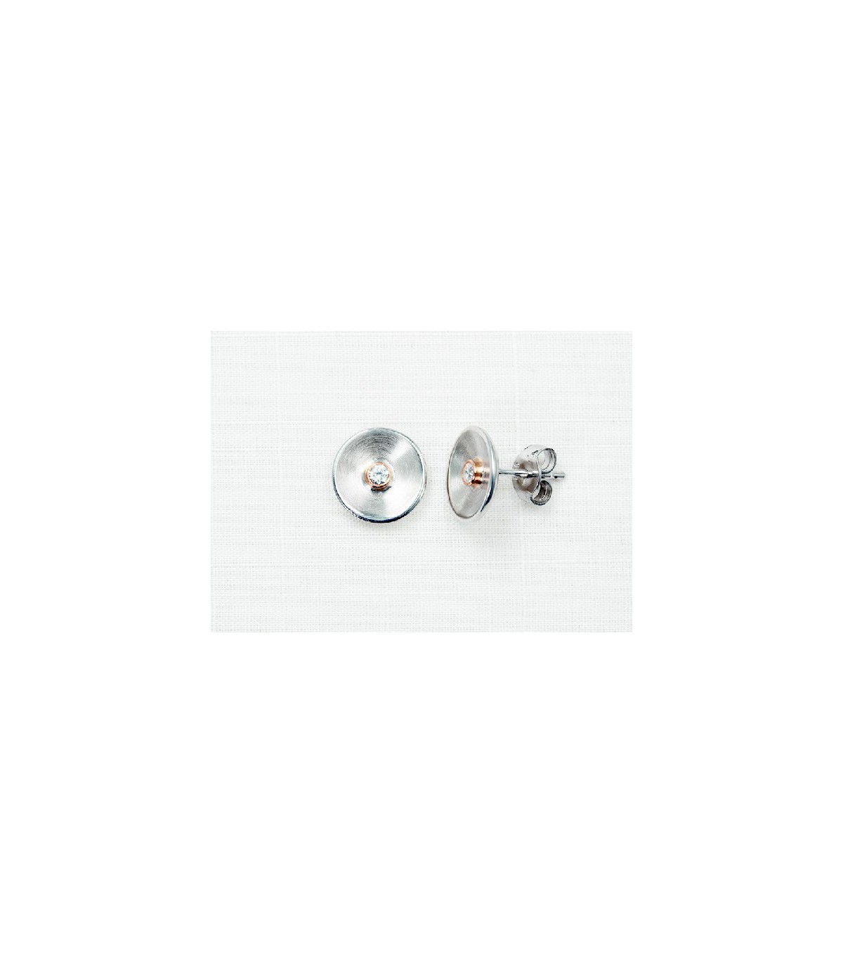 Pendientes en Plata de Ley 925 mls, de 10 mm, satinado, forma ligeramente curbada Una circonita central engastada en chaton con oro rosa. Cierre de presión, faciles de colocar. El collar a juego disponibles en nuestra web forman un conjunto perfecto.