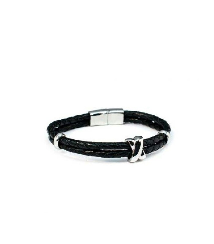 BRAZALETE PARA HOMBRE CON DOBLE CUERO NEGRO TRENZADO. LARGO 20,5cm.CIERRE MAGNETICO DE ACERO 316L.MATERIAL ANTIALÉRGICO.