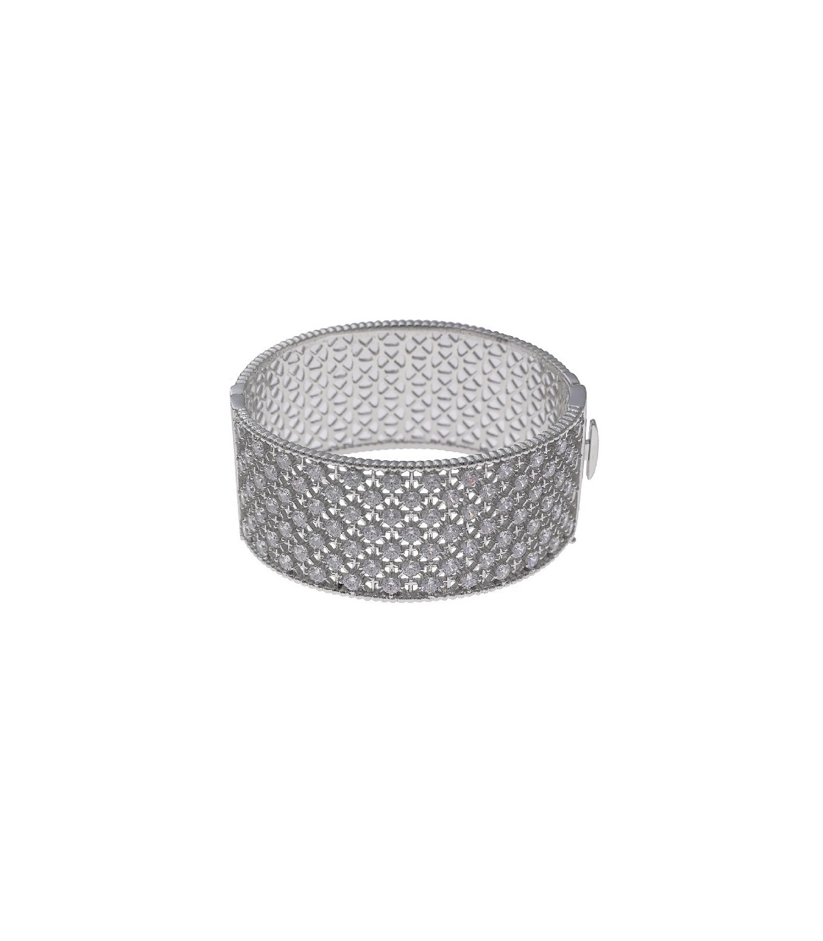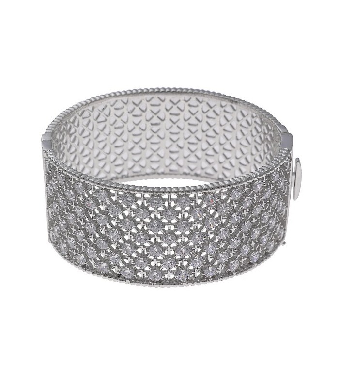 Pulsera rigida en Plata de Ley 925 mls rodiada. Diseño filigrana, completamenta engastada de Circonitas blancas. Ancho 4cm. Articulada por la mitad con un cierre de clip muy seguro. Una joya de gran calidad con un acabado perfecto.